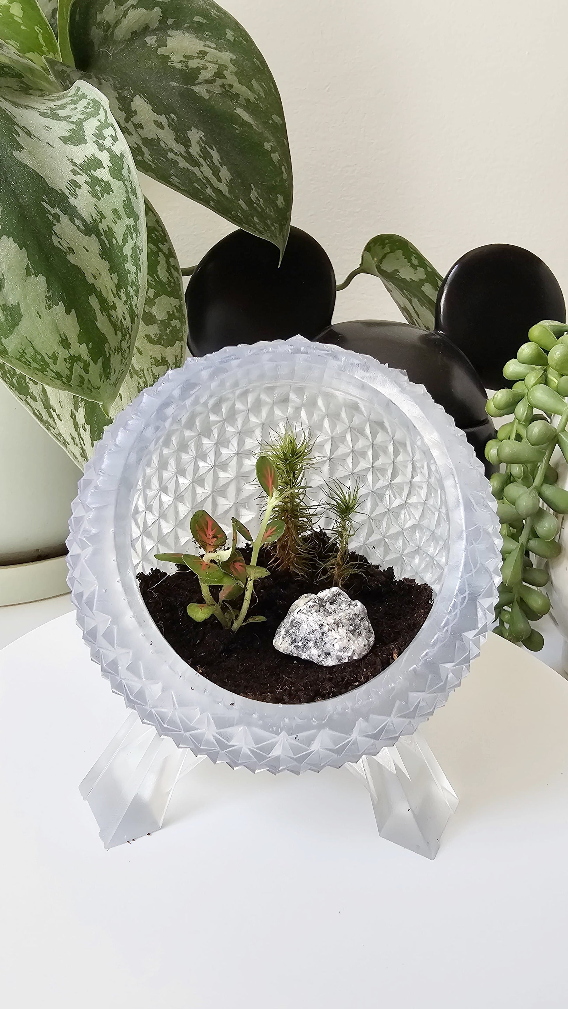 This striking resin terrarium is a tribute to EPCOT’s most iconic symbol—Spaceship Earth. At 90mm tall and 82mm wide, it’s perfectly sized to hold air plants, tiny terrarium worlds, or simply stand alone as a stunning sculptural piece.